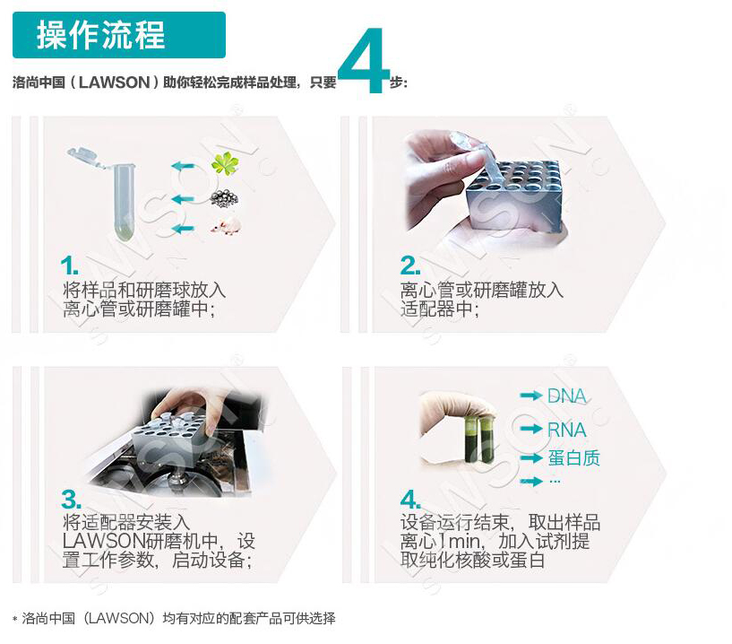 洛尚中國(LAWSON)DHFSTPRP-CL24 冷凍研磨儀是一種特殊的、快速的、高效率的、多試管的一致系統。它能將任何來源(包括土壤、植物和動物的組織/器官、細菌、酵母、真菌、孢子、古生物標本等)的原始DNA、RNA和蛋白質進行提取和純化。 樣品處理的三大關鍵要素: